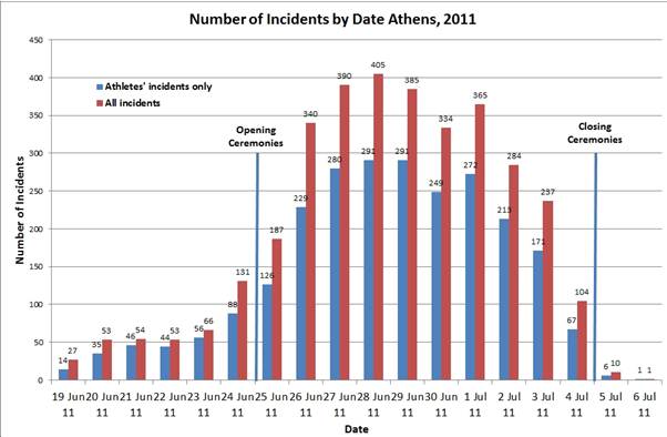 3,426 Medical Encounters were recorded in HEALTHone between 19th June, 2011 when athletes began arriving in Athens for acclimatisation and training and 6th July, 2011 when the last athletes left Athens. The distribution of Medical Encounters by date is shown below.