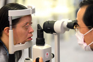 | A Special Olympics volunteer ophthalmologist examines the eyes of an athlete during the World Summer Games in Shanghai in October 2007 |